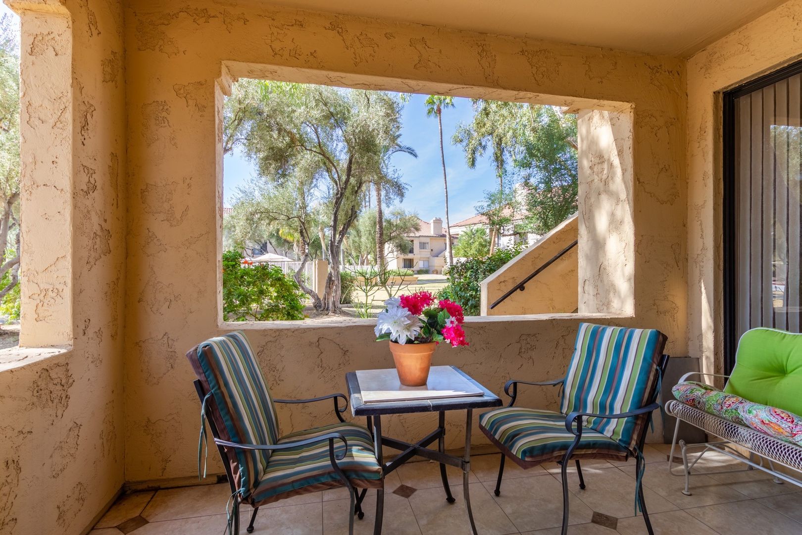 Don't miss out on this fantastic opportunity to lease this ground floor 2bed/2bath condo in the amazing resort style community of The Racquet Club in Scottsdale Ranch. Light and bright interior features tile flooring, charming corner fireplace and a 2 covered patios. Perfect for sipping your morning coffee. Gorgeous kitchen boasts stainless steel appliances, granite counter tops, tile back splash and a plethora of beautiful white cabinetry. Very nice master with it's own patio and an ensuite. You'll love all the amenities of the Racquet Club: 5 pools, 6 spas, 9 lighted tennis courts, clubhouse, tennis pro, sauna, 24 hour gate guard, HOA and so much more. Take advantage of the Scottsdale location. Close to shopping, restaurants, golf, hiking and freeways. Don't miss out . See it today!